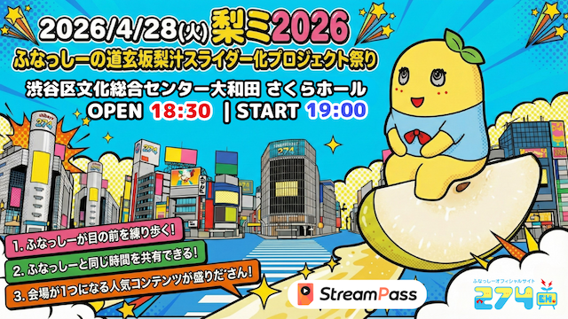 【4/28 19:00~】ふなっしー/274ch.プレゼンツ 「梨ミ2026 ふなっしーの道玄坂梨汁スライダー化プロジェクト祭り in東京」